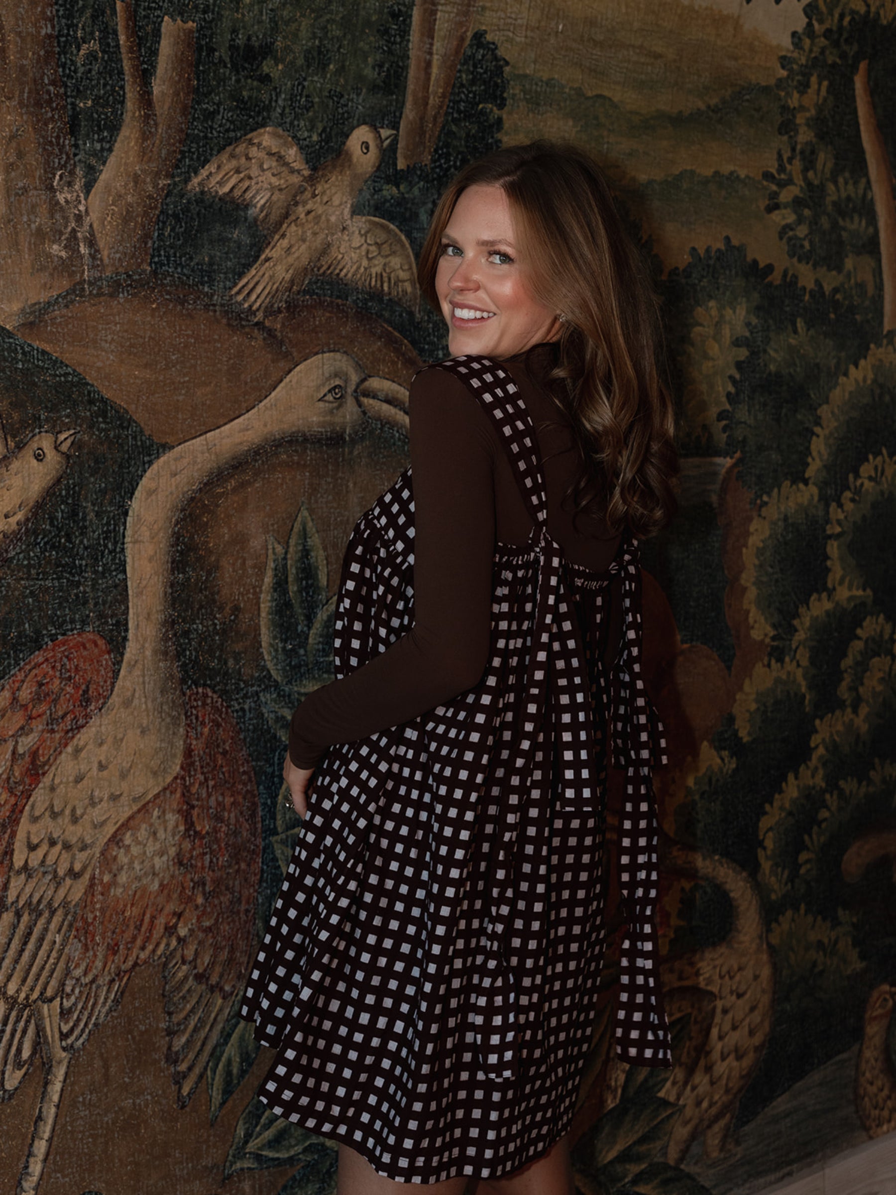 Our signature tie dress, designed with fully functional shoulder ties for a customizable fit. Style them knotted in the back, tied in a bow, or as a halter. Finished with coordinating boxers for easy wear and added coverage. Unlined.