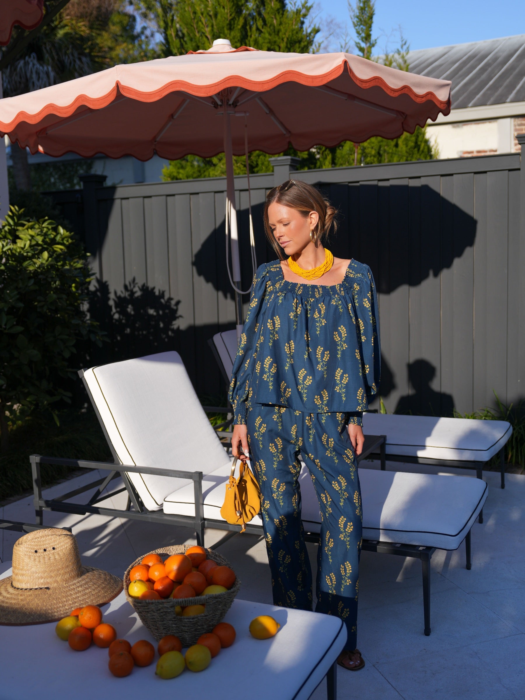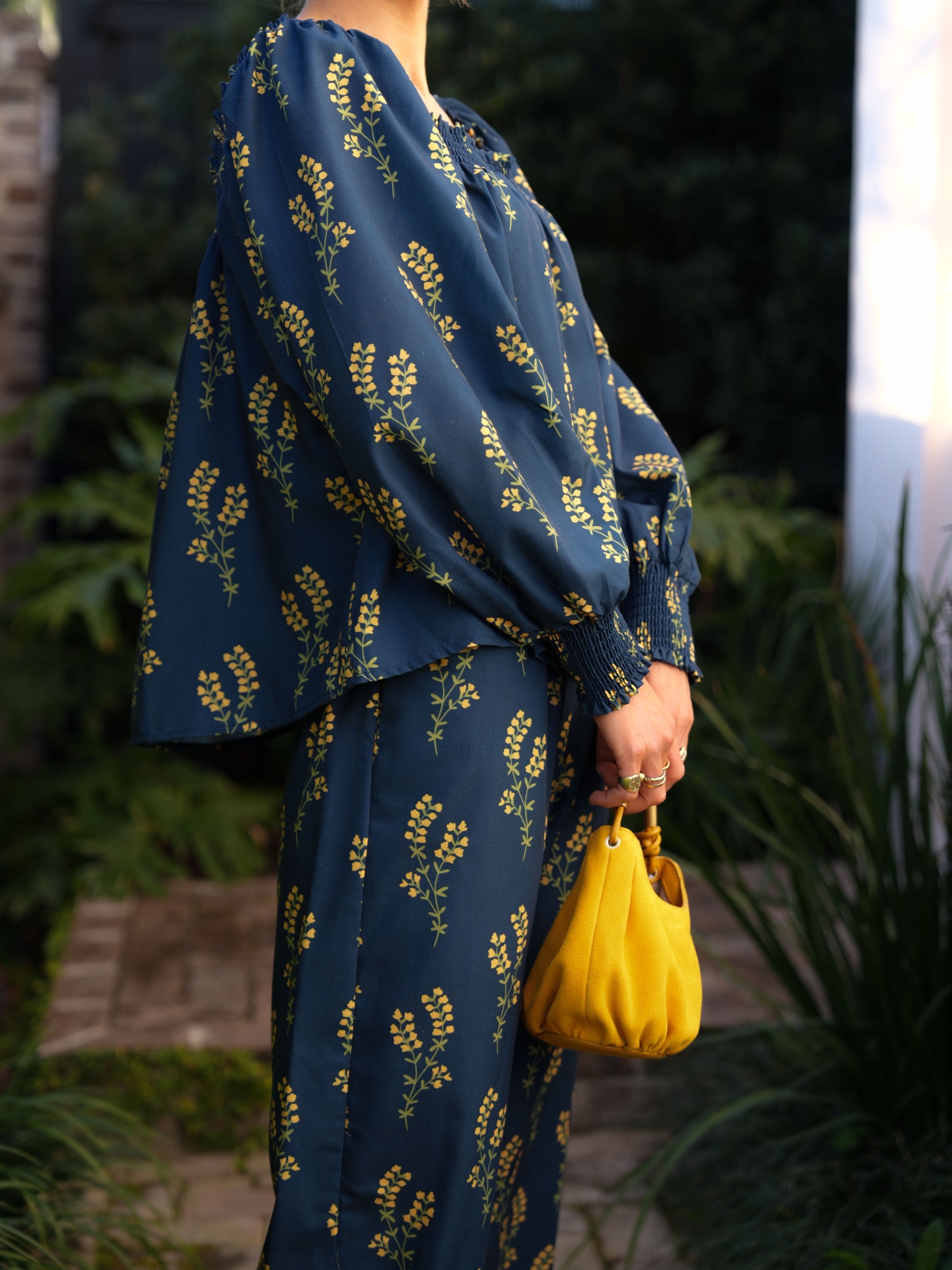 The Lila Set features a long sleeve, blousy top with a flattering elastic ruched square neckline that can be worn on or off the shoulder. The softly billowed sleeves fall into an elastic ruched wrist cuff for an easy, comfortable fit. It pairs with matching pants that gently flare at the leg, feature an elastic waistband, and are finished with pockets. Top and pants are unlined.