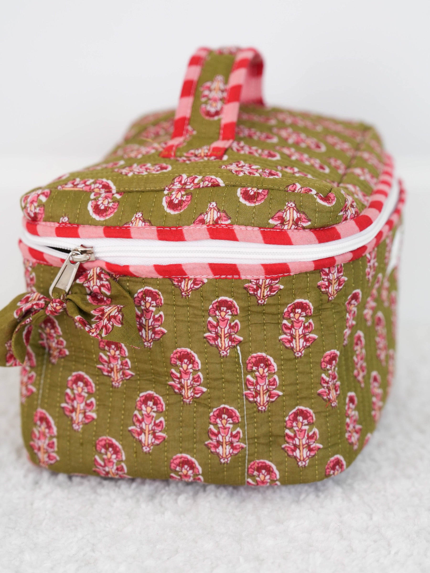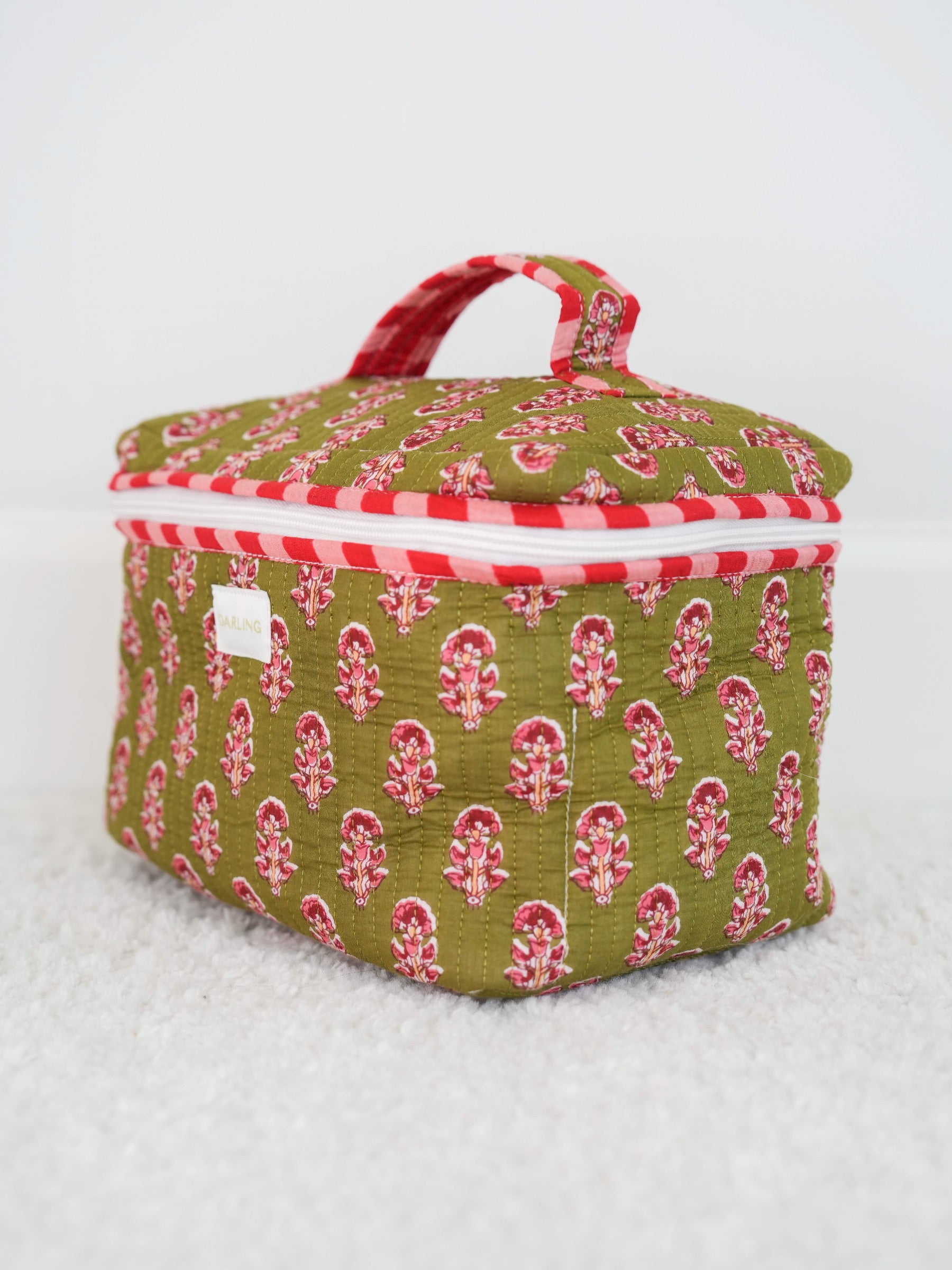A spacious cosmetic bag designed to hold all your beauty and makeup essentials. Fully lined with a waterproof interior for easy cleaning and durability. Finished with a top handle for effortless toting at home or on the go.