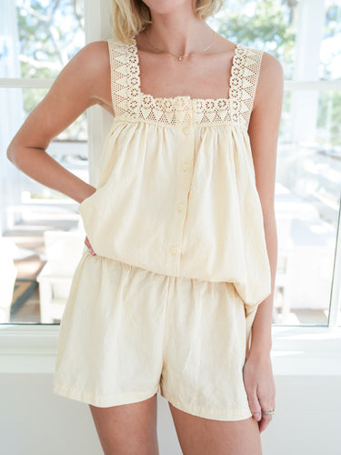 A lightweight cotton set that doubles as sleepwear or an easy summer outfit. The top features a square eyelet neckline with functional button closure. The matching shorts have an elastic waistband for a comfortable fit. Designed to be worn as a set, please note the blouse is not long enough to be worn alone. Top and bottom are unlined.