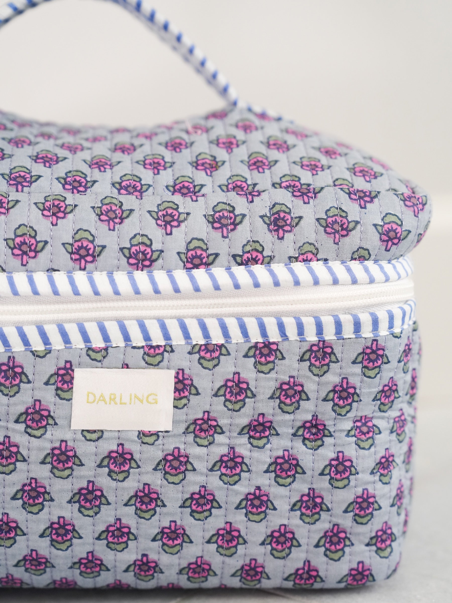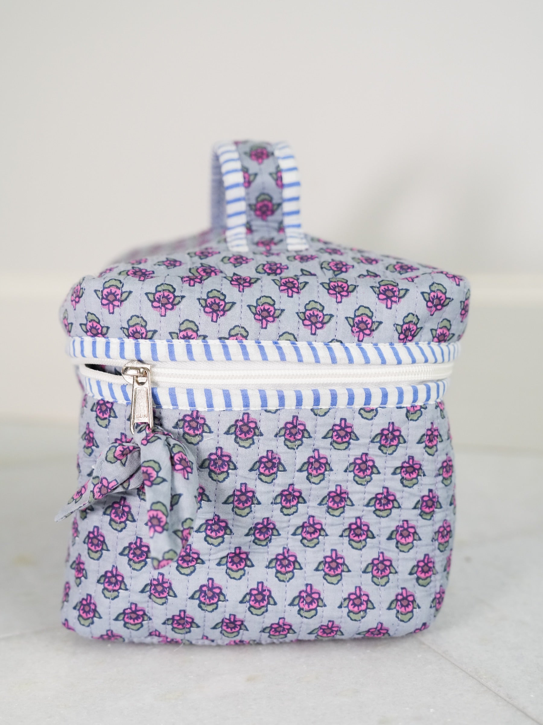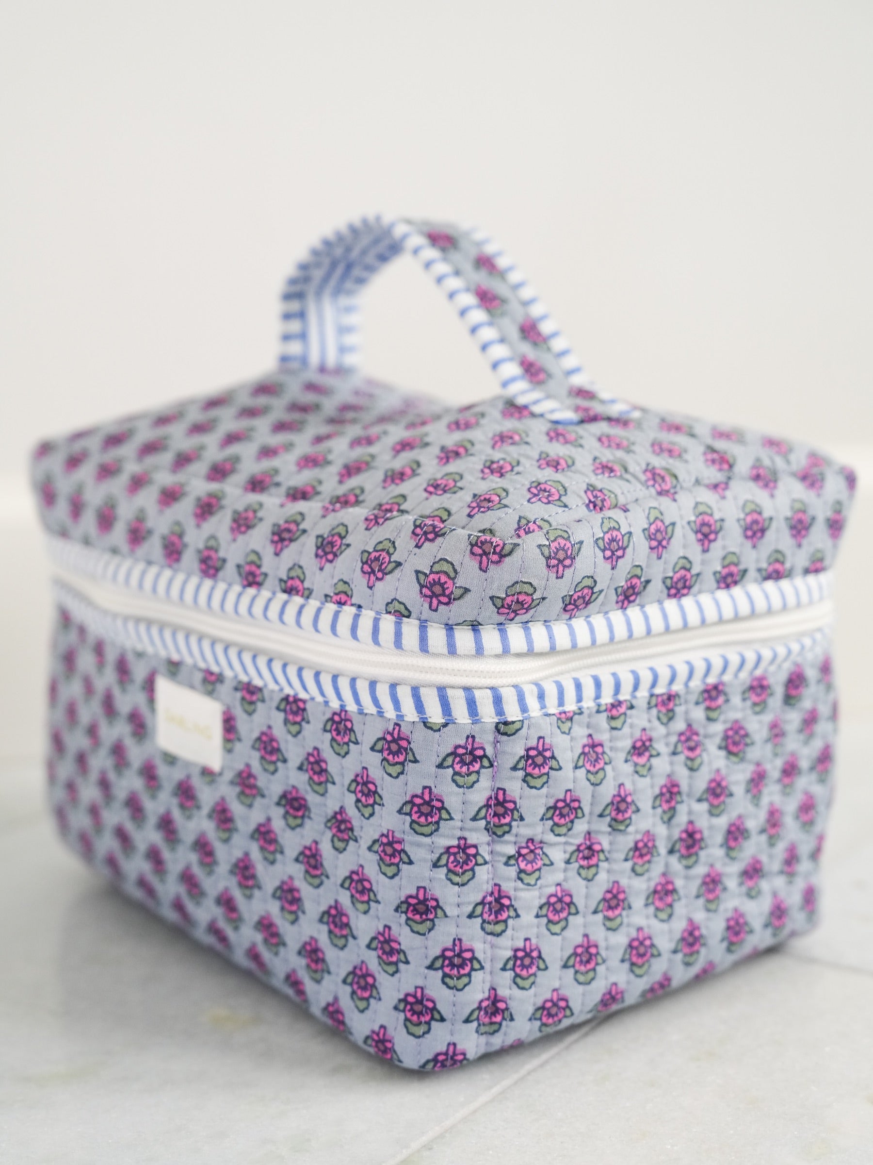 A spacious cosmetic bag designed to hold all your beauty and makeup essentials. Fully lined with a waterproof interior for easy cleaning and durability. Finished with a top handle for effortless toting at home or on the go.